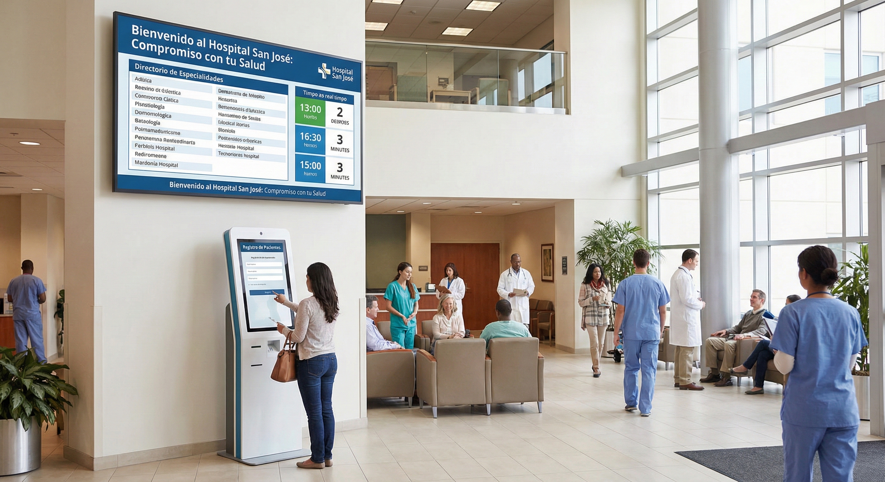 Sistemas de gestión de turnos y entretenimiento para salas de espera en clínicas y hospitales.