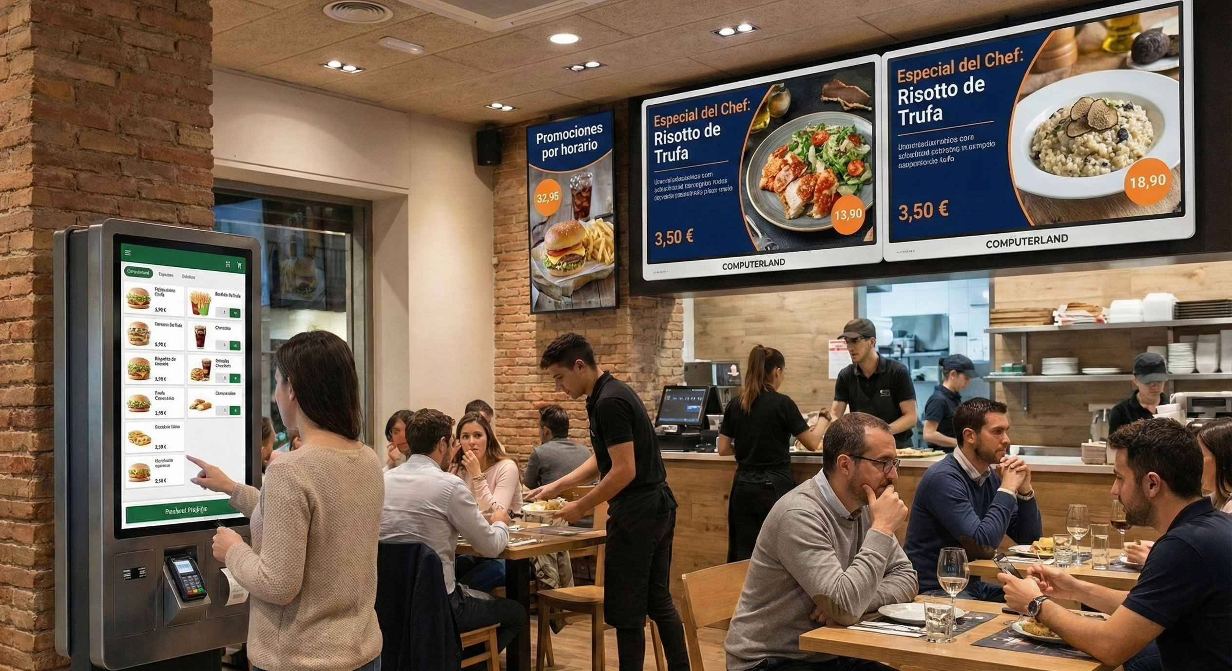 Pantallas para restaurantes con actualización de precios, promociones y contenido dinámico.
